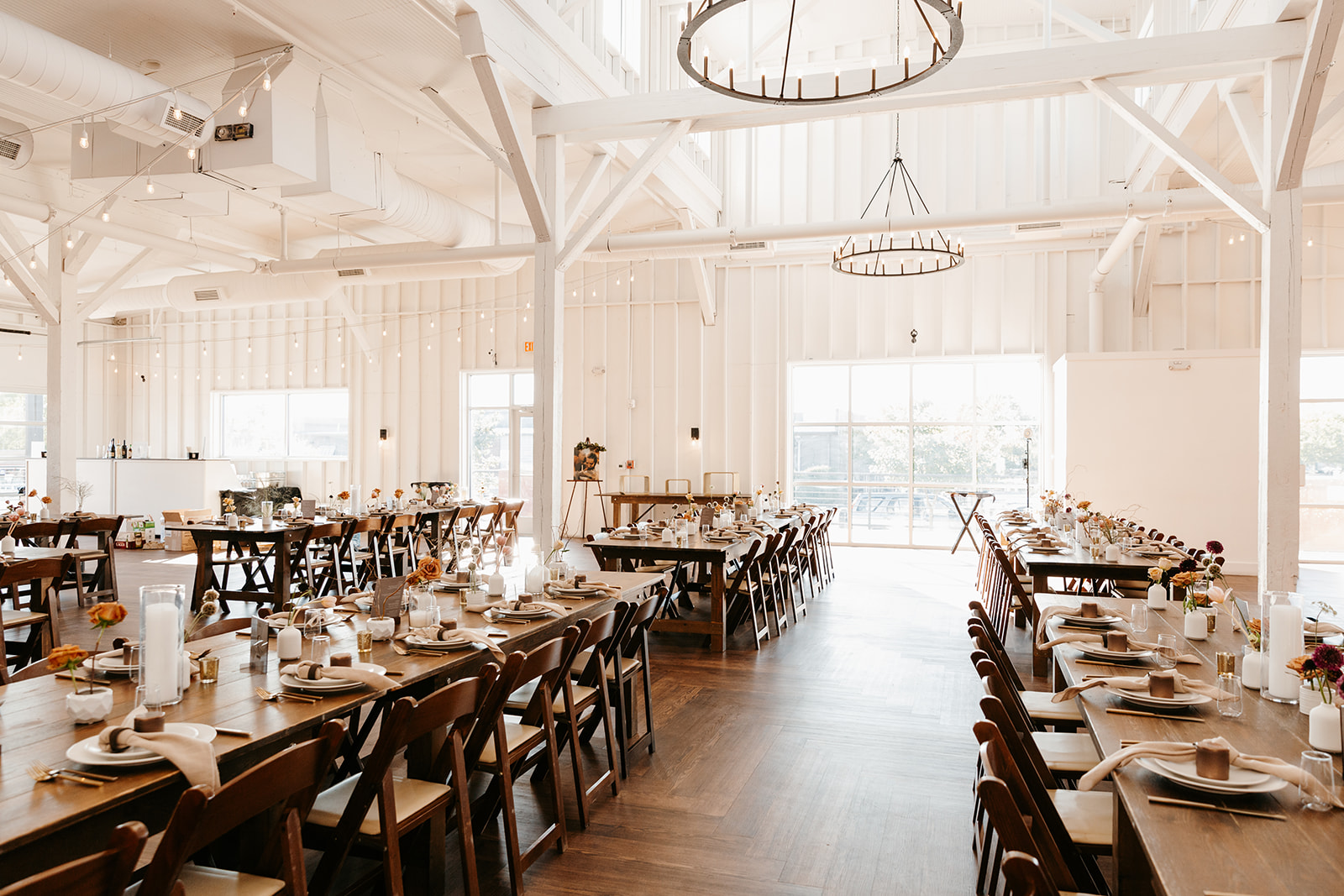 We do provide tables and chairs for your use for up to 200 guests. Our farmhouse tables do not require linens but we can help coordinate renting these if you’d like them. We offer a range of decor items like draping and hedge walls to customize your event. All our bar packages include physical bars and plasticware. We also offer glassware as an optional add-on.