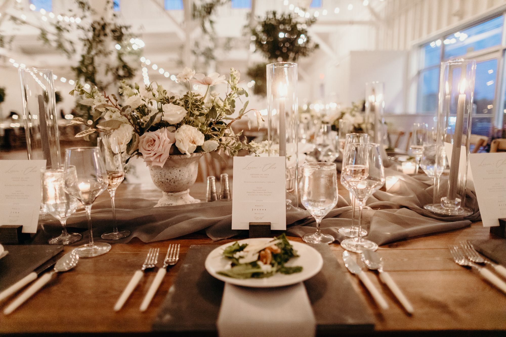 We offer faux greenery, gold votives, gold table numbers, and tea lights for seating tables.